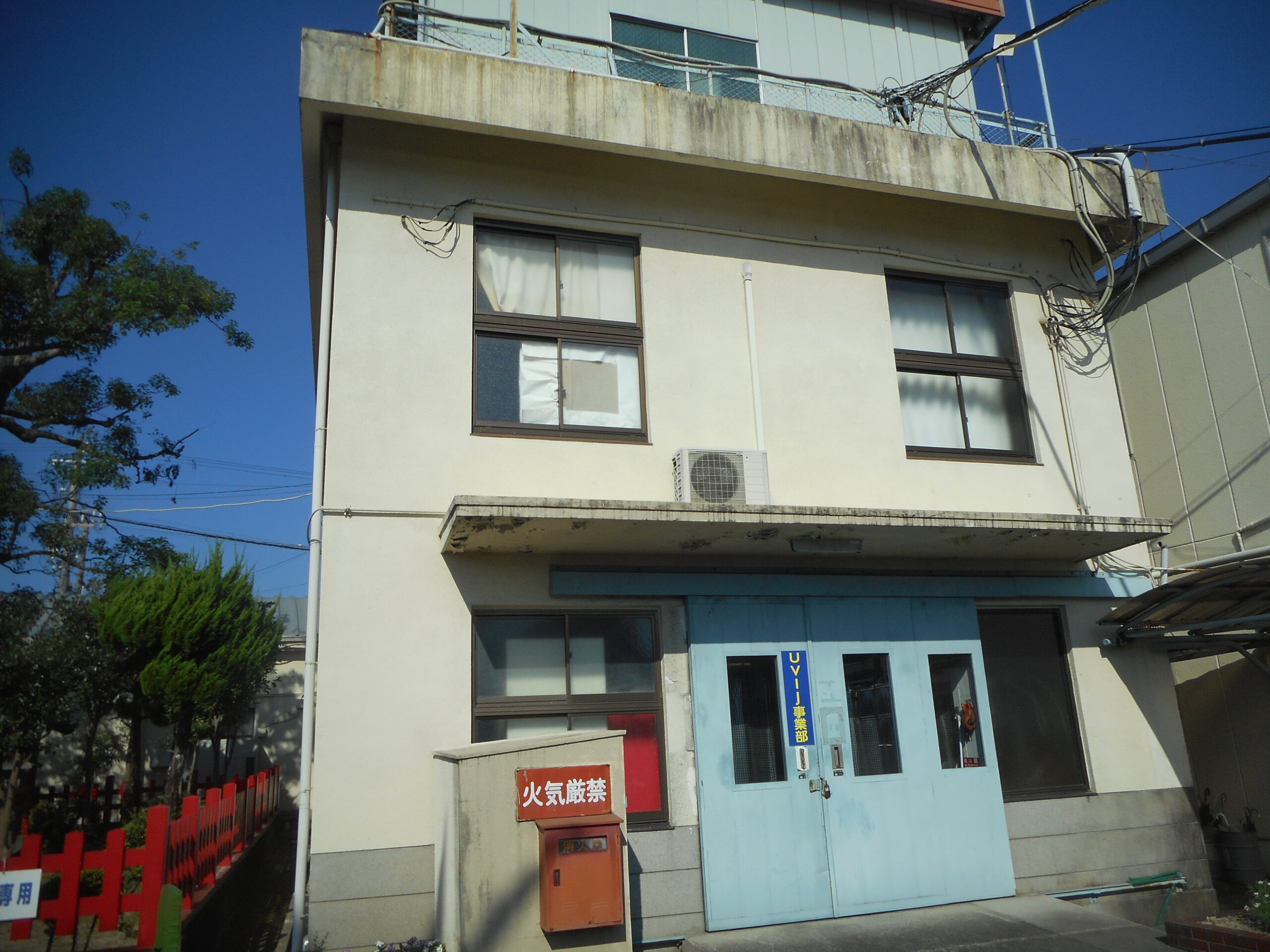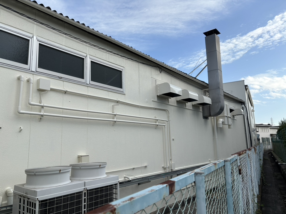 外壁からの雨漏りを止めるためコーキング打ち替えを行い、シリコン塗料で塗装、雨漏りが止まり、外壁も綺麗に!屋根塗装は遮熱塗料を採用し工場内の室内温度上昇を抑え作業環境を快適化